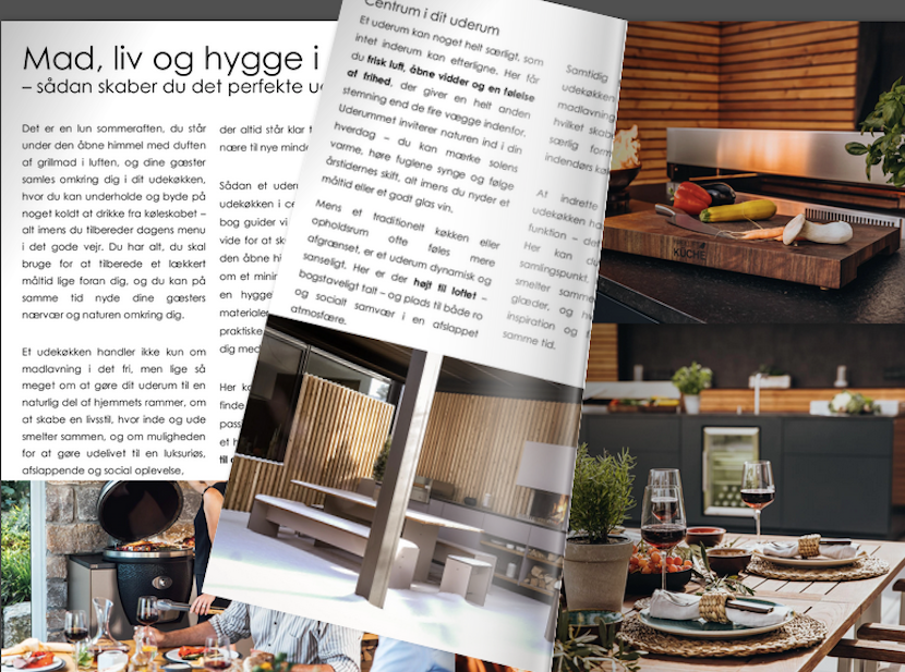 Men er du i tvivl om, hvor du skal starte? Så læs vores gratis guide- og inspirationskatalog til udekøkkener. Kataloget klæder dig godt på med praktiske tips, værdifulde ekspertråd og masser af inspiration, så du kan træffe alle de rette beslutninger, når det kommer til bl.a. materialer, form, design og udstyr ↓