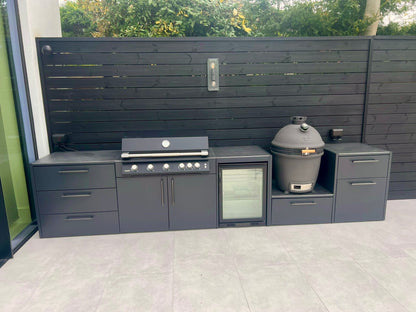 Med denne modulpakke får du elegant og funktionelt udekøkken, der har både mange muligheder og meget plads. Den store og robuste gasgrill i høj kvalitet giver dig mulighed for at tilberede lækre måltider til mange gæster på én gang, mens håndvasken, køleskabet, den generøse bordplads og de mange praktiske opbevaringsløsninger sørger for, at du har alt, hvad du behøver for at håndtere alle aspekter af madlavningen nemt og effektivt.